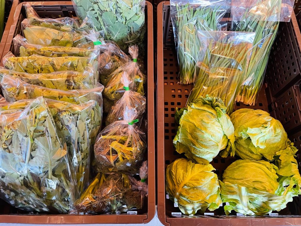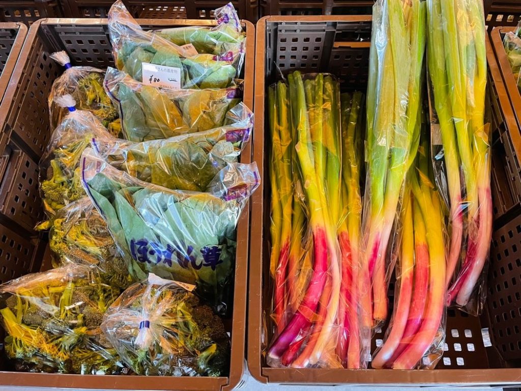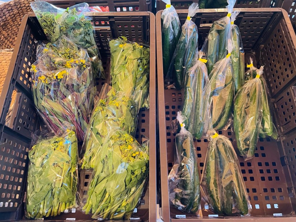 菜花、赤ネギ、きゅうりなど旬の採れたて野菜を入荷しております。