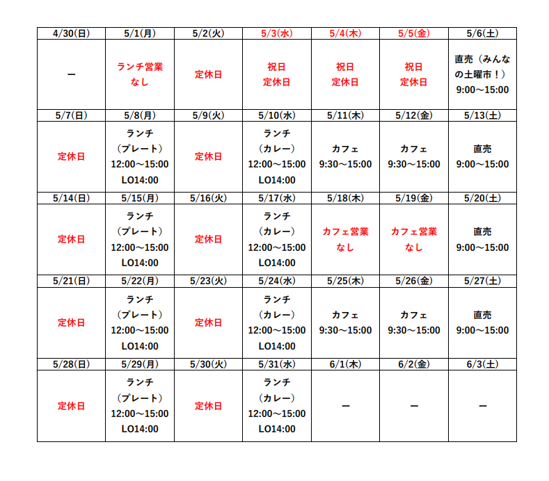 また、5/18(木)と5/19(金)のカフェは団体利用があるため休業いたします。