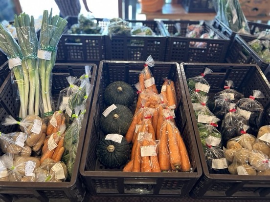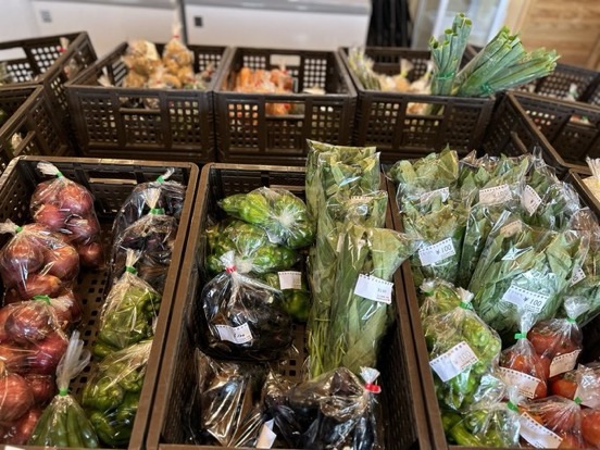 本日キャベツ、紫玉ねぎ、モロヘイヤ、ねぎ、ピーマン、にら、にんじん、かぼちゃ、とうもろこし、きゅうり、トマトなどの採れたて野菜が入ってきております。