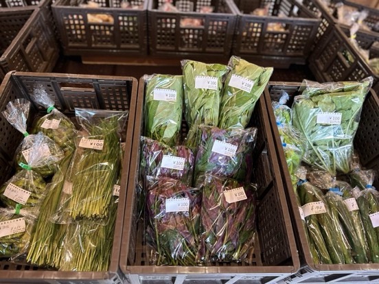 本日金時草、ニラ、里芋、さつまいも、かぼちゃ、空芯菜、きゅうり、ピーマン、なす、などの採れたて野菜が入ってきております。