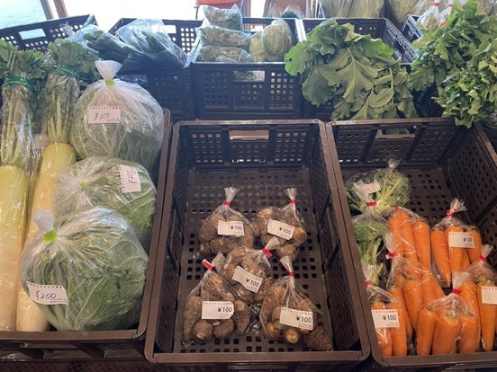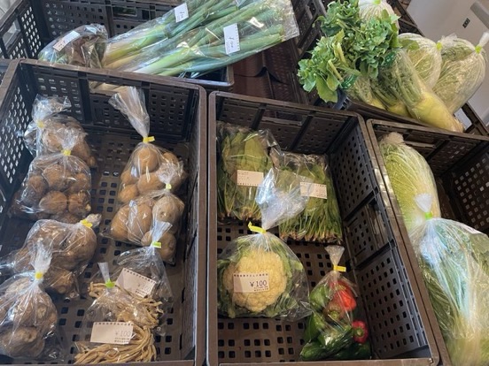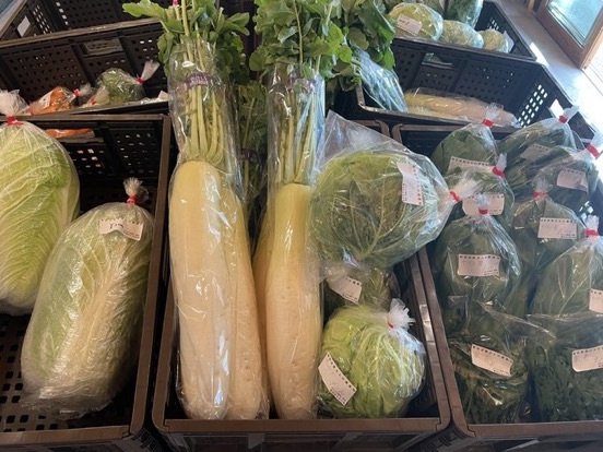 本日は大根、白菜、ブロッコリー、にんじん、キャベツ、チンゲン菜、ねぎ、春菊、さつまいも、里芋、ゆずなどの採れたて野菜が入ってきております。