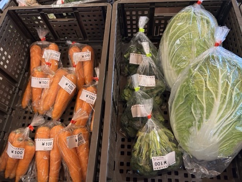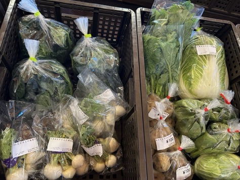 本日はキャベツ、チンゲン菜、小松菜、にんじん、大根、白菜、ブロッコリー、カブなどの採れたて野菜が入ってきております。