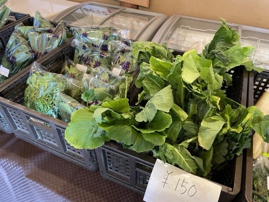 本日はカブ、ねぎ、ほうれん草、キャベツ、チンゲン菜、小松菜、かぶ、大根、白菜などの採れたて野菜が入ってきております。
