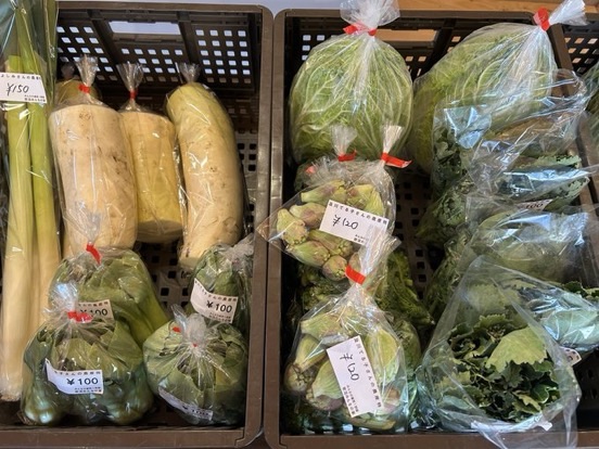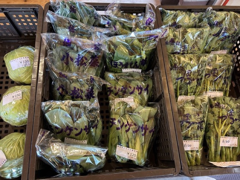 本日はつぼみ菜、ふきのとう、りんご、ほうれん草、キャベツ、チンゲン菜、小松菜、大根、白菜などの採れたて野菜が入ってきております。