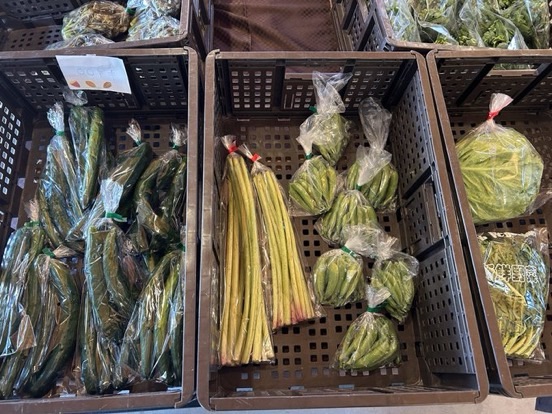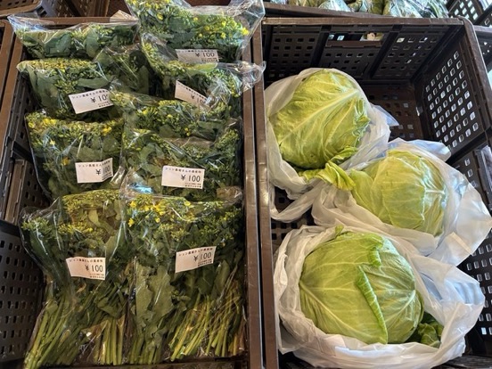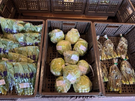 本日はキャベツ、タラの芽、つぼみ菜、きゅうり、フキ、スナップえんどう、ほうれん草、ゆきなの花などの採れたて野菜が入ってきております。