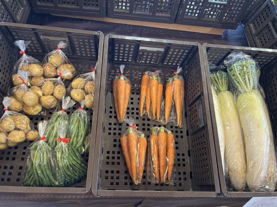本日はいんげん、にんじん、玉ねぎ、じゃがいも、レタス、大根、きゅうり、スナップえんどう、キャベツなどの採れたて野菜が入ってきております。