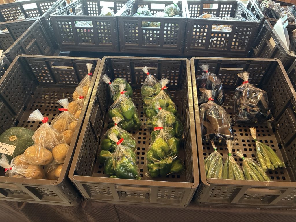 本日はなす、オクラ、きゅうり、ツルムラサキなどの採れたて野菜が入ってきております。