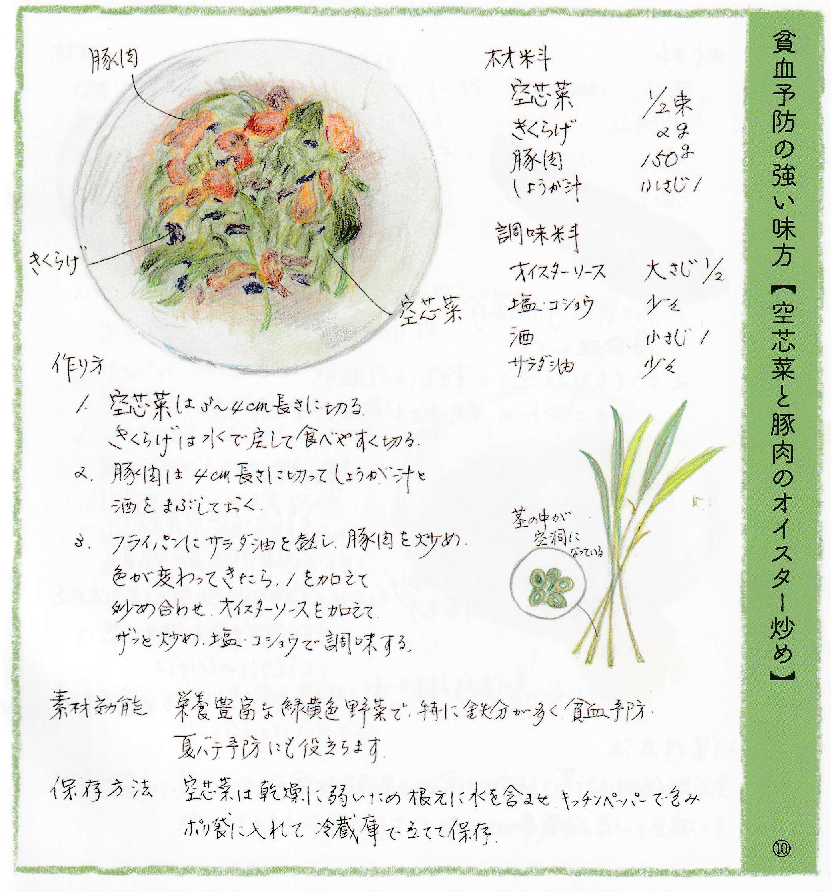 空芯菜は、夏に旬を迎え、身体の余分な熱を取り除き渇きを癒やす働きや、便秘の改善、血液をきれいにして、鼻血や血尿を止める作用もあるとされています。