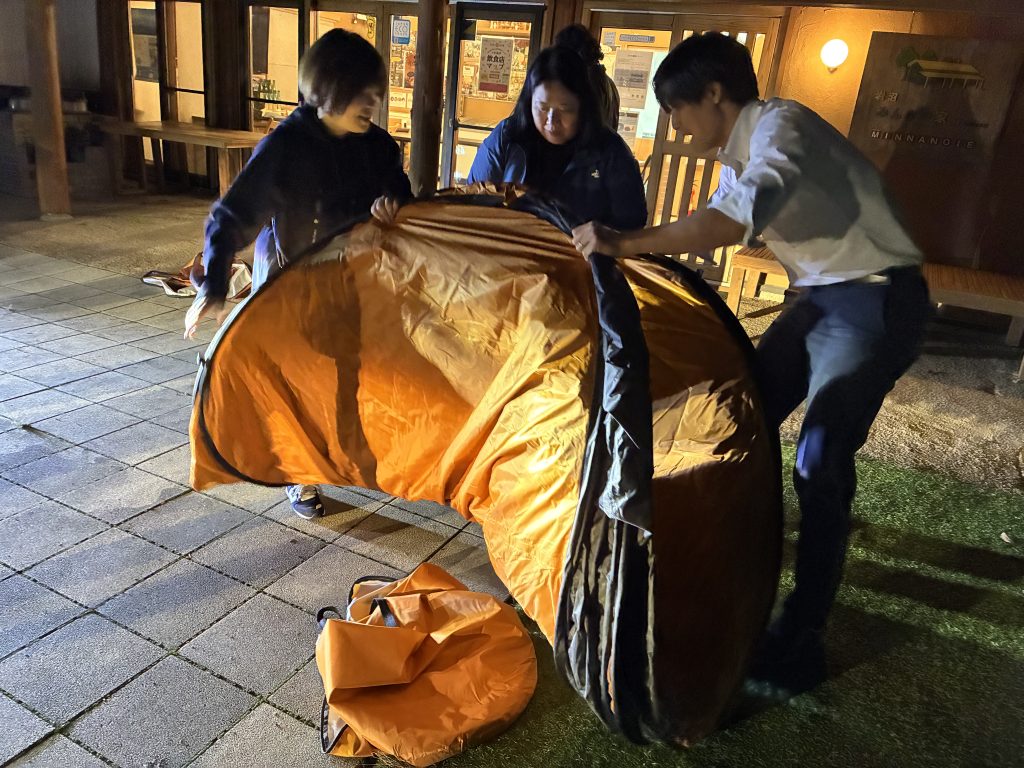 畳むのには意外とコツが必要です。市役所職員の方からお手本を見せてもらいながら仕舞っていきます。