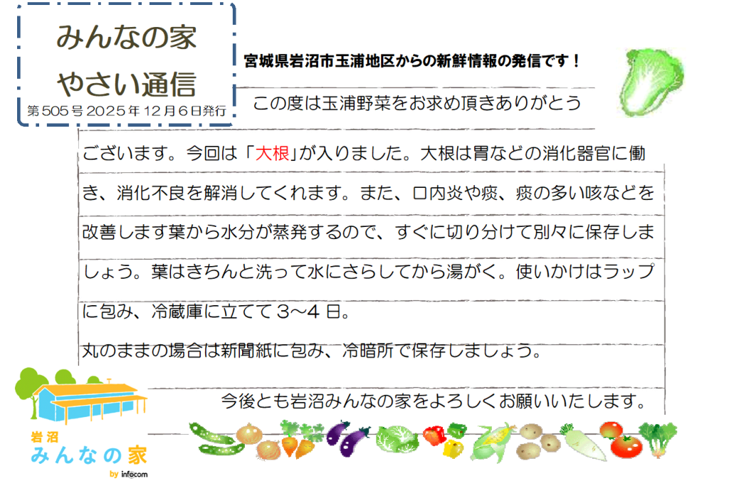 この度はみんなの家の直売野菜をお求めいただきましてありがとうございます。